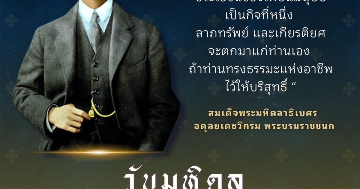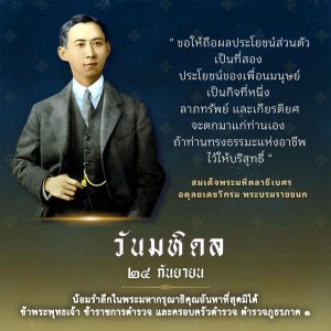 “ ขอให้ถือผลประโยชน์ส่วนตัวเป็นที่สอง ประโยชน์ของเพื่อนมนุษย์เป็นกิจที่หนึ่ง ลาภทรัพย์และเกียรติยศจะตกมาแก่ท่านเอง ถ้าท่านทรงธรรมะแห่งอาชีพไว้ให้บริสุทธิ์ “ สมเด็จพระมหิตลาธิเบศร อดุลยเดชวิกรม พระบรมราชชนก