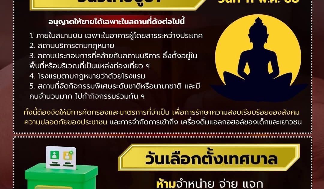 งดจำหน่าย จ่าย แจก จัดเลี้ยงสุราทุกประเภท ในเขตเลือกตั้ง