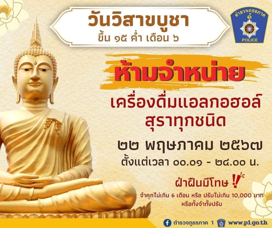 สำนักงานตำรวจแห่งชาติเตือนห้ามขายเครื่องดื่มแอลกอฮอล์ทุกชนิด เนื่องในวันสำคัญทางศาสนา “วันวิสาขบูชา”