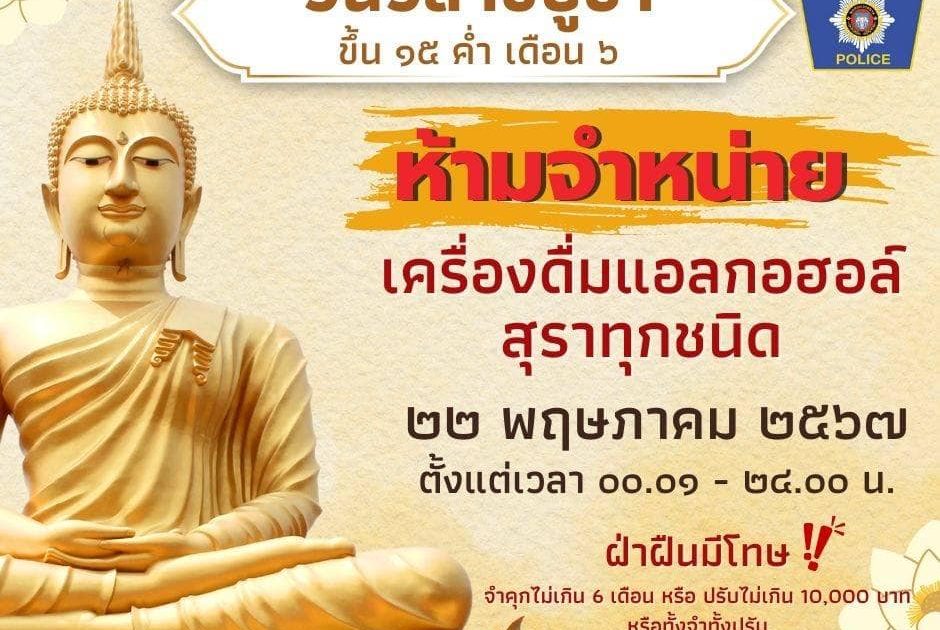 เมื่ิอวันที่ 21 พฤษภาคม 2567 พล.ต.ต.หญิง สมพร พูลเกษม ผู้บังคับการกองสารนิเทศ เปิดเผยว่า ด้วยวันที่ 22 พฤษภาคม 2567 เป็น “วันวิสาขบูชา” และมีประกาศสำนักนายกรัฐมนตรี เรื่อง กำหนดวันห้ามขายเครื่องดื่มแอลกอฮอล์ (ฉบับที่ 3) พ.ศ.2558 ห้ามมิให้ผู้ใดขายเครื่องดื่มแอลกอฮอล์ในวันมาฆบูชา วันวิสาขบูชา วันอาสาฬบูชา วันเข้าพรรษา และวันออกพรรษา ยกเว้นเฉพาะร้านค้าปลอดอากรภายในอาคารท่าอากาศยานนานาชาติ โดยมีกระทรวงสาธารณสุขเป็นหน่วยรับผิดชอบควบคุม กำกับ ดูแล ตามพระราชบัญญัติควบคุมเครื่องดื่มแอลกอฮอล์ พ.ศ.2551