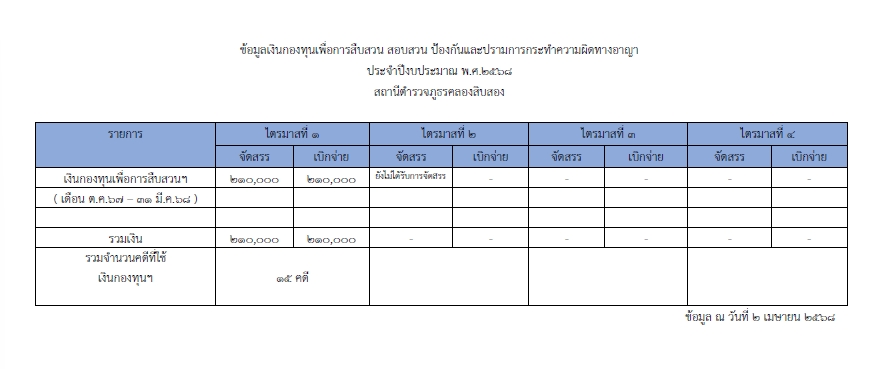 Download เอกสาร ข้อมูลเงินกองทุนเพื่อการสืบสวน สอบสวน ป้องกันและปรามการกระทำความผิดทางอาญา สถานีตำรวจภูธรคลองสิบสอง